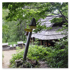 Po porannym, bardzo obfitym śniadaniu w Schronisku PTTK Krmenaros ruszyliśmy w drogę. Szlak przebiega tuż za naszym schroniskiem, mimo to aby do niego dojść trzeba przejść parę metrów drogą asfaltową, a następnie skręcić na parking gdzie na jego końcu jest kasa biletowa do BdPN. Na początku szlak jest płaski, przechodzi przez potok, następnie prowadzi nadbrzeżnymi zaroślami i łąką aby dojść do granicy lasu. Tu zaczyna się pierwsze podejście. Przebieg szlaku przez las jest zróżnicowany raz pod górkę innym razem łagodnie więc nie jest bardzo męczący. Pojawiają się też ułatwienia w postaci „schodów” szczególnie w jego końcowym odcinku.
