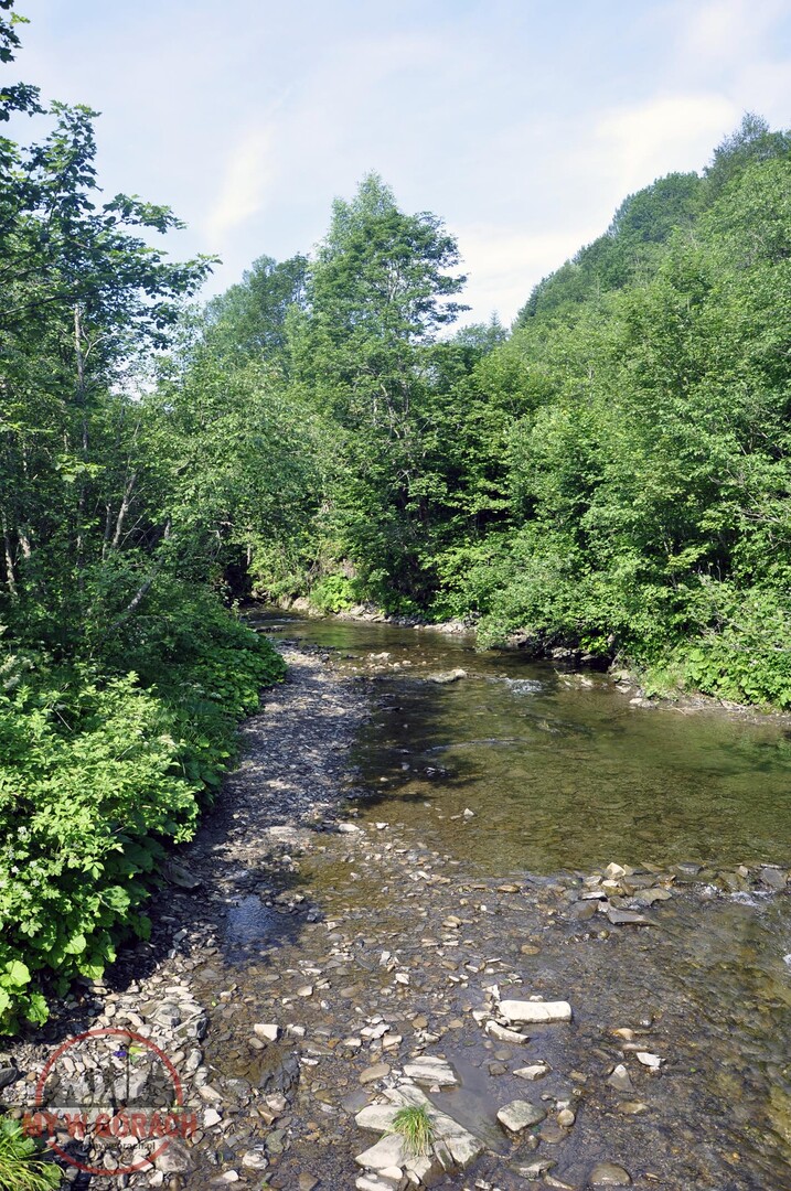 Po porannym, bardzo obfitym śniadaniu w Schronisku PTTK Krmenaros ruszyliśmy w drogę. Szlak przebiega tuż za naszym schroniskiem, mimo to aby do niego dojść trzeba przejść parę metrów drogą asfaltową, a następnie skręcić na parking gdzie na jego końcu jest kasa biletowa do BdPN. Na początku szlak jest płaski, przechodzi przez potok, następnie prowadzi nadbrzeżnymi zaroślami i łąką aby dojść do granicy lasu. Tu zaczyna się pierwsze podejście. Przebieg szlaku przez las jest zróżnicowany raz pod górkę innym razem łagodnie więc nie jest bardzo męczący. Pojawiają się też ułatwienia w postaci „schodów” szczególnie w jego końcowym odcinku.